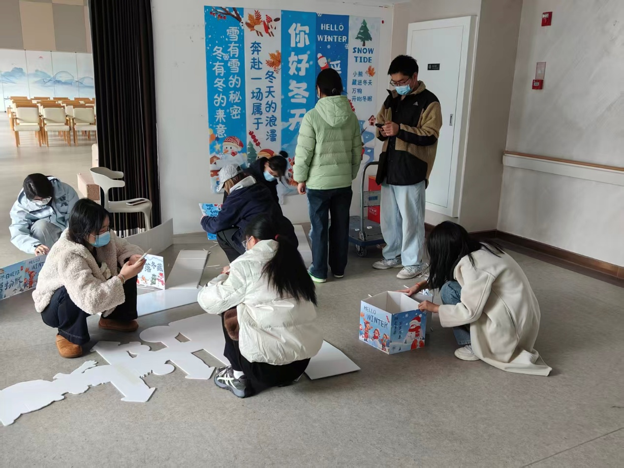 生日会圆满结束后,冬日主题活动现场的布置也逐步开始进行,同学们分工协作,高效完成桌椅摆放、横幅悬挂、物资分类及指示牌设置等任务。大家默契配合,从制作礼盒到细节装饰,充分展现了团队协作能力。经过大家的努力,场地整洁有序,充满活力色彩。