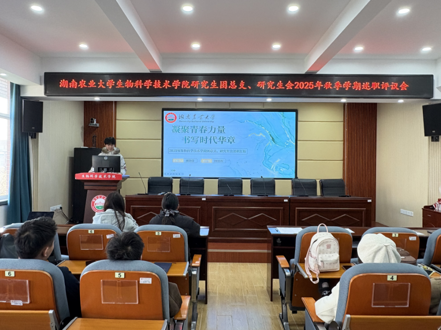研究生会执行主席胡钧涛率先代表学院团学组织作整体工作汇报,以 “凝聚青春力量,书写时代华章” 为主题,从组织架构、工作成效、工作创新三大维度展开。他介绍了研究生网格化管理员制度、奖助学金评选办法等制度建设成果,以及干部队伍培养举措;重点汇报了党旗领航系列党课、学术活动节、宿舍文化节、“生科志愿行” 等品牌活动成效;分享了网格化管理模式、品牌活动打造、组织文化塑造等创新实践,全面展现了学生组织的服务效能与担当。